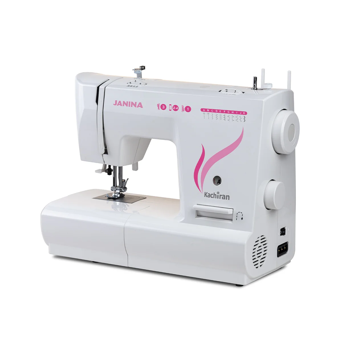 The Janina 4010+ sewing machine is lightweight and very quiet in addition to being strong. Different types of zigzag sewing machine sewing patterns are marked on the body with letters. Each model is selected with the sewing model selection wheel located on the right side of the sewing machine (below the handwheel) and the sewing pattern is shown on the visual display. Kachiran Janina is one of the new products of Kachiran company, available in the Iranian and global markets in three series: 4010 (with 10 types of stitching), 4020 (with 23 types of stitching) and 4030 (with 32 types of stitching), in both normal and plus models.