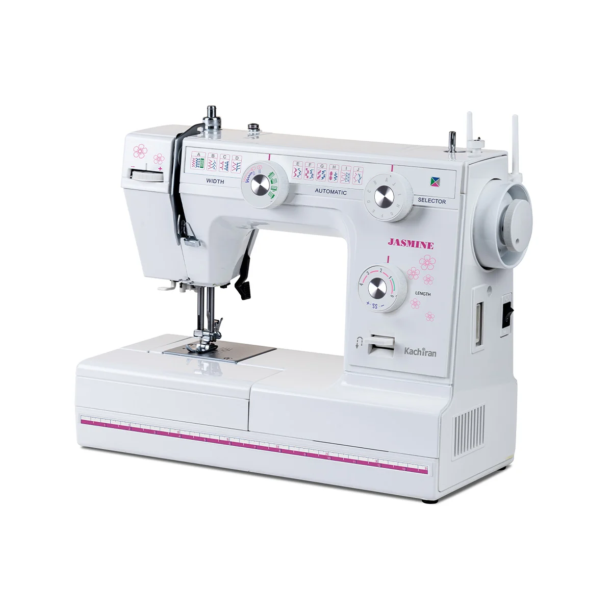 The Model “692+” sewing machine is one of the professional export products and part of the Jasmine family of sewing machines from “Kachiran” company. This beautiful sewing machine by supporting different sewing patterns, provides the possibility for the user to perform various types of sewing using this machine. The machine has a lightweight and strong aluminum body. It can do sewing widths from 0 to 5 mm and sewing lengths from 0 to 4 mm. The 692+ model offers a total of 22 sewing designs with the combinations. The pedal of this model is electronic, making the machine easier to use. This model also supports stretch stitching, which is an important application and feature for stretch fabrics. The Kachiran export sewing machine Model 692+ features a built-in handle for easy carrying. This high-quality sewing machine can sew with two needles and includes a simple and convenient bobbin winding system. The ability to sew buttonholes, zippers, cotton rope and blind hem stitches is also available in this. For more comfortable sewing, the model includes a flat surface and an extension plate. It should be noted that this machine has safety approval from the Institute of Standards and RoHs, with all electrical components in it installed under the European CB Scheme and CE of Industrial Research of Iran.