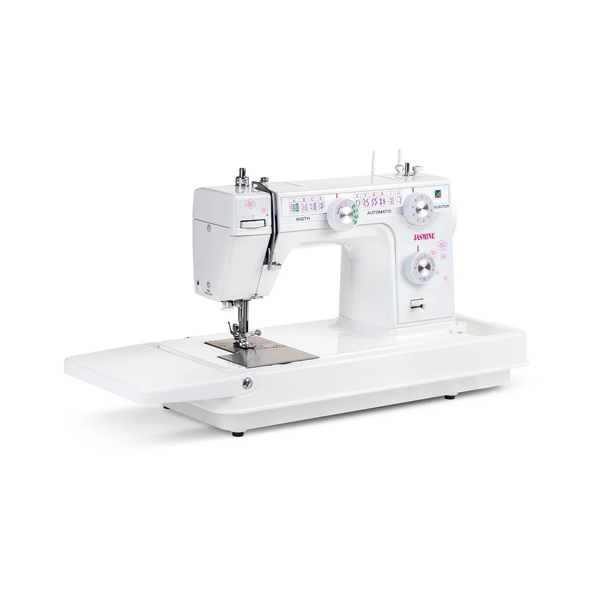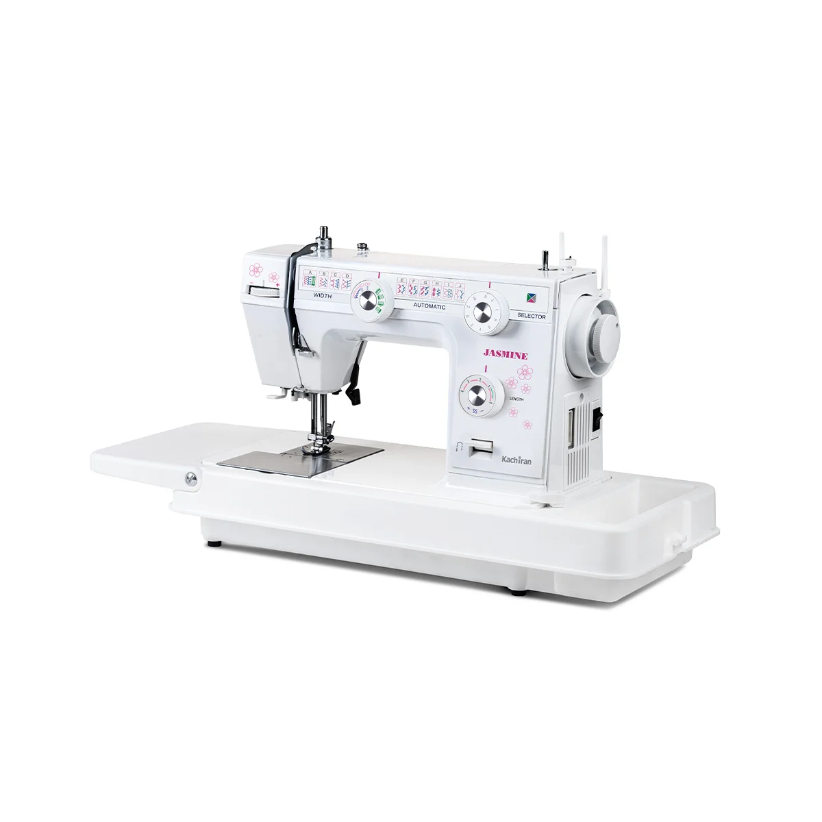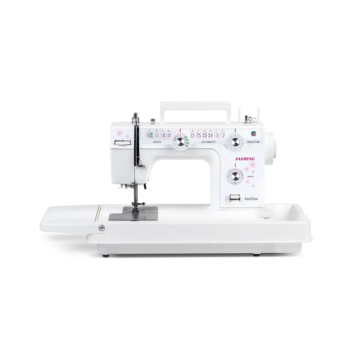 The Model “693+” sewing machine is one of the professional export products and part of the Jasmine family of sewing machines from “Kachiran” company. This beautiful sewing machine by supporting different sewing patterns, provides the possibility for the user to perform various types of sewing using this machine. The machine has a lightweight and strong aluminum body. It can do sewing widths from 0 to 5 mm and sewing lengths from 0 to 4 mm. The 693+ model offers a total of 22 sewing designs with the combinations. The pedal of this model is electronic, making the machine easier to use. This model also supports stretch stitching, which is an important application and feature for stretch fabrics. The Kachiran export sewing machine Model 693+ features a built-in handle for easy carrying. This high-quality sewing machine can sew with two needles and includes a simple and convenient bobbin winding system. The ability to sew buttonholes, zippers, cotton rope and blind hem stitches is also available in this. For more comfortable sewing, the model includes a flat surface and an extension plate. It should be noted that this machine has safety approval from the Institute of Standards and RoHs, with all electrical components in it installed under the European CB Scheme and CE of Industrial Research of Iran.